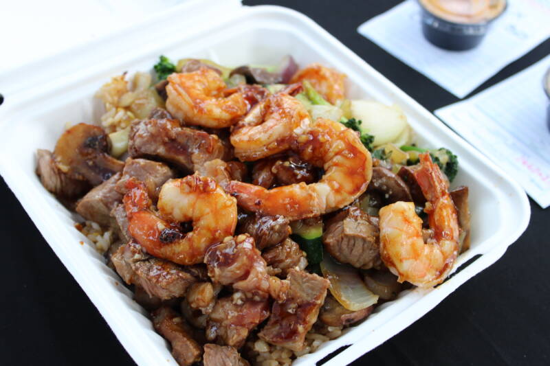 All entrees include garlic fried rice, mixed fresh local vegetables, and scratch made yum yum sauce. Veggies consist of locally sourced zucchini, onion, mushrooms, and broccoli. Fresh blended garlic and Tiger's famous smokey Terriyaki is essential to each plate.